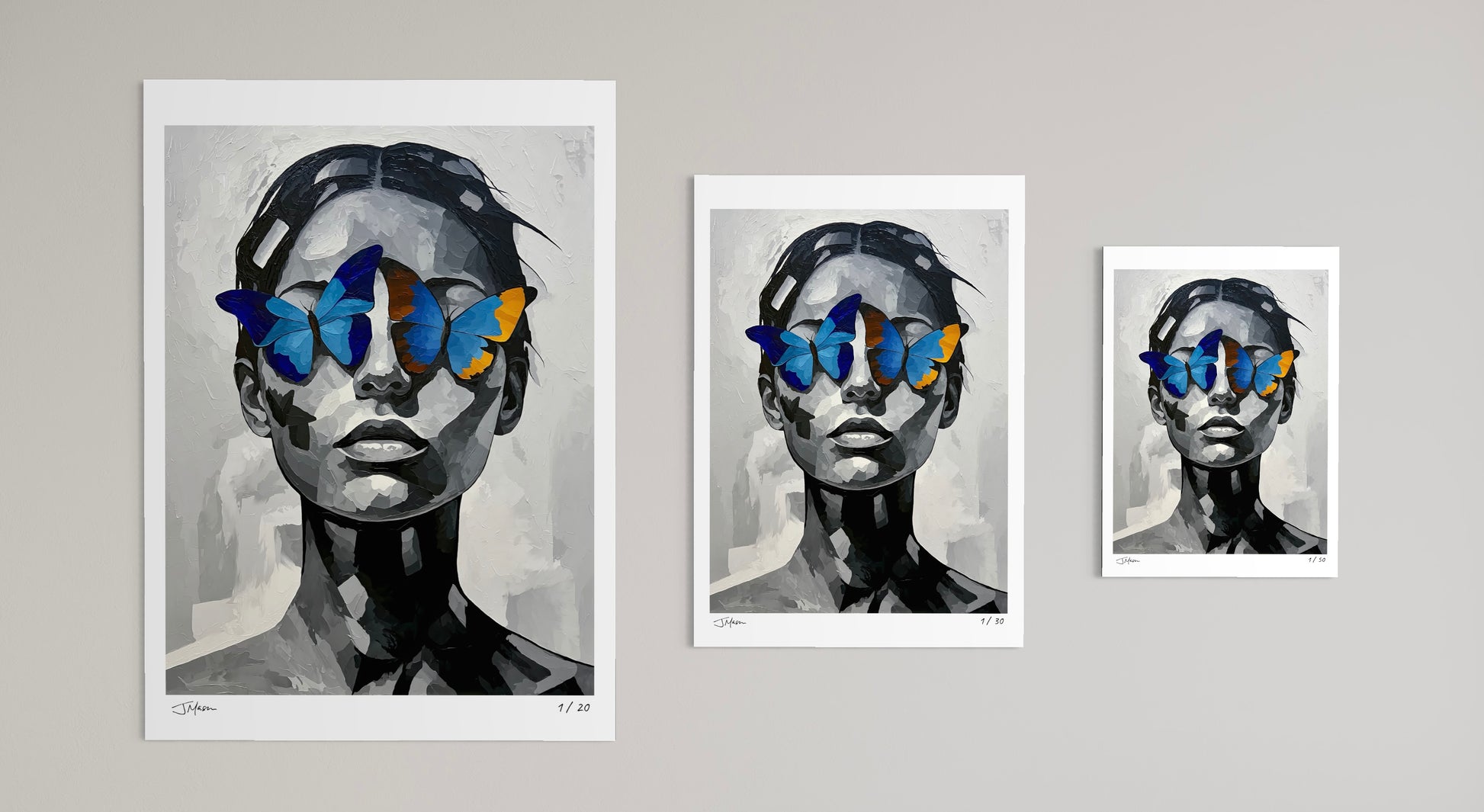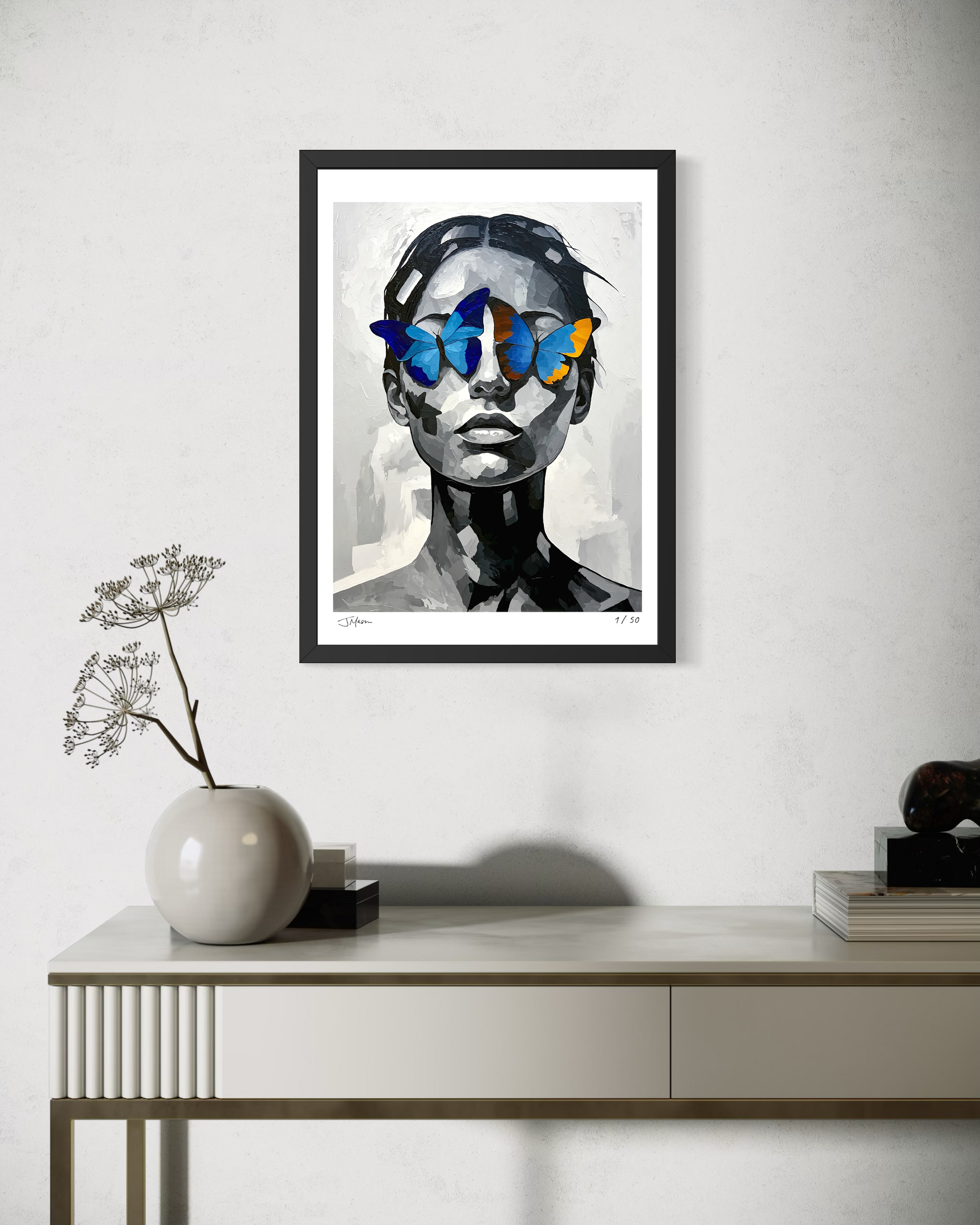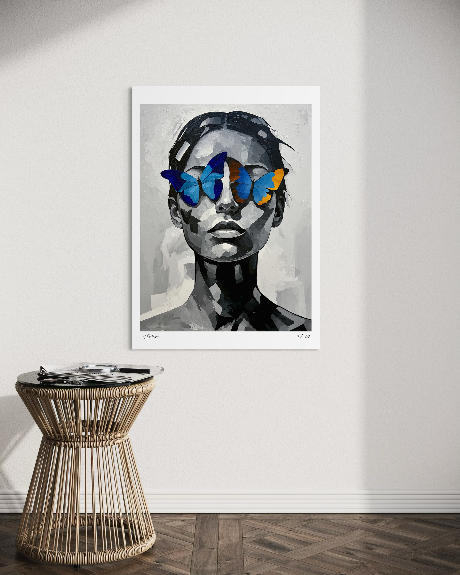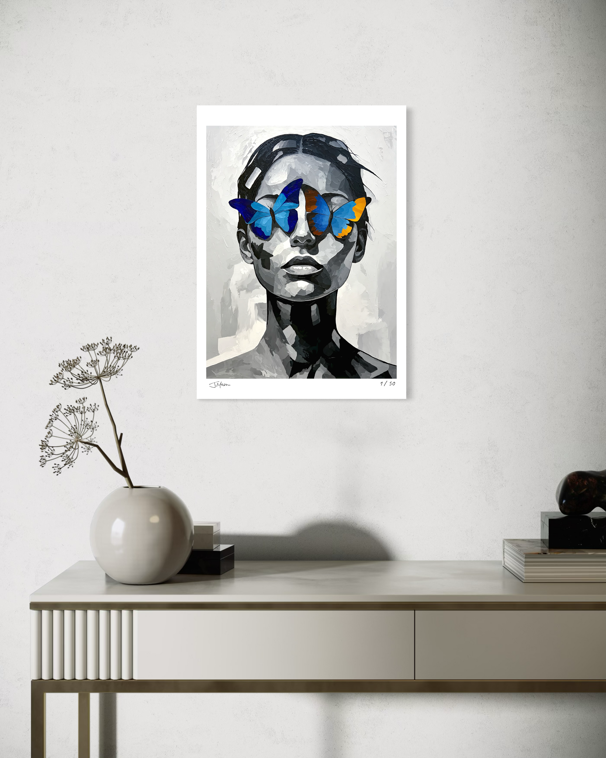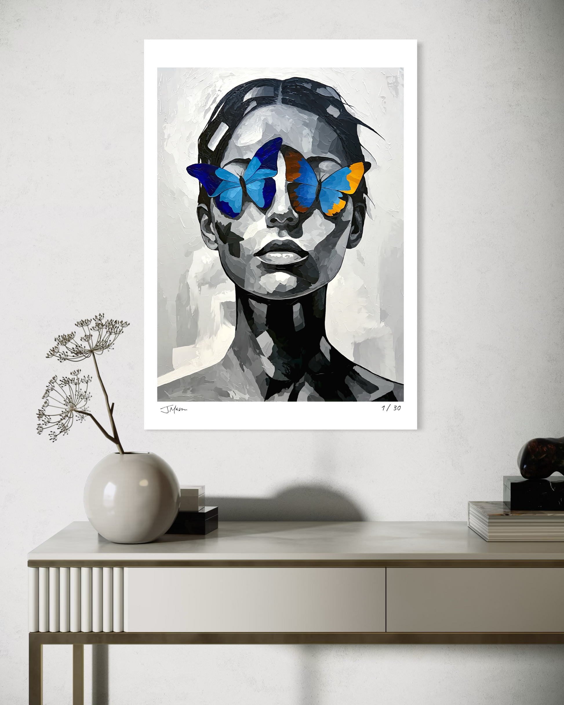 Emergence captures a moment of inner change. The figure is painted in monochrome tones, while colour appears only through the butterflies that replace the eyes, suggesting a shift in how the world is seen.