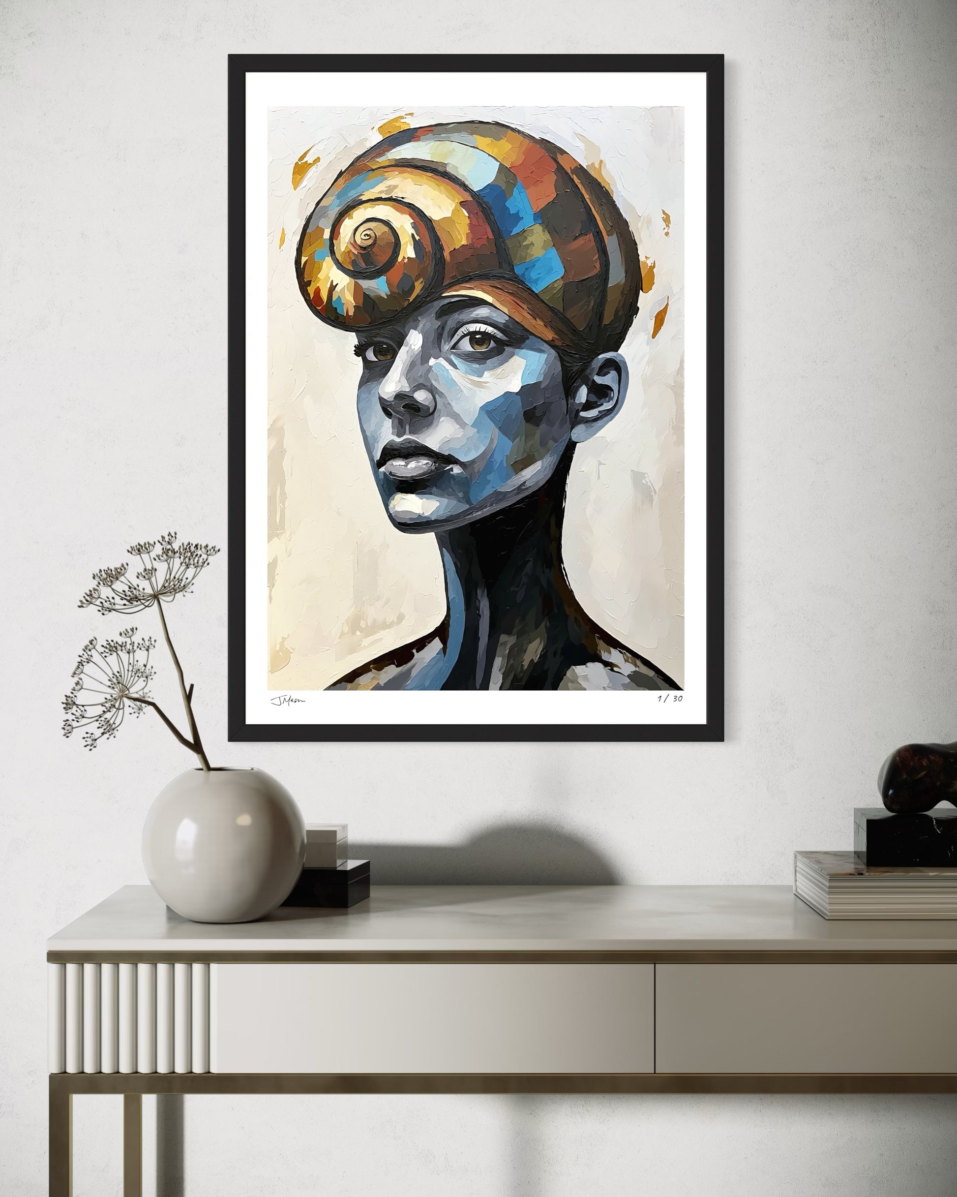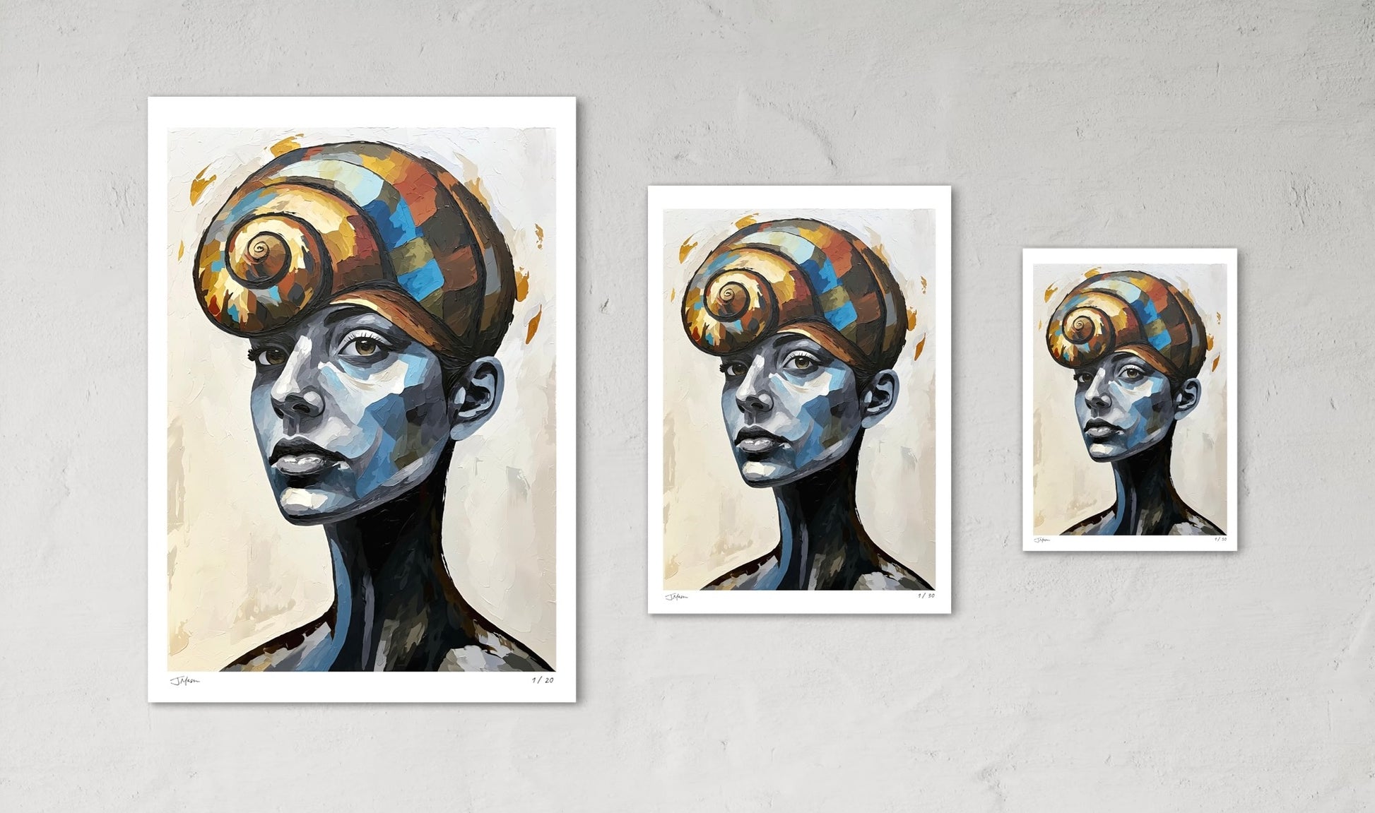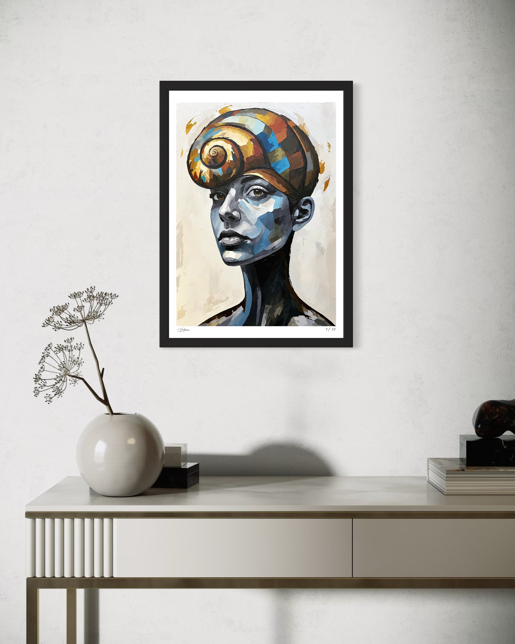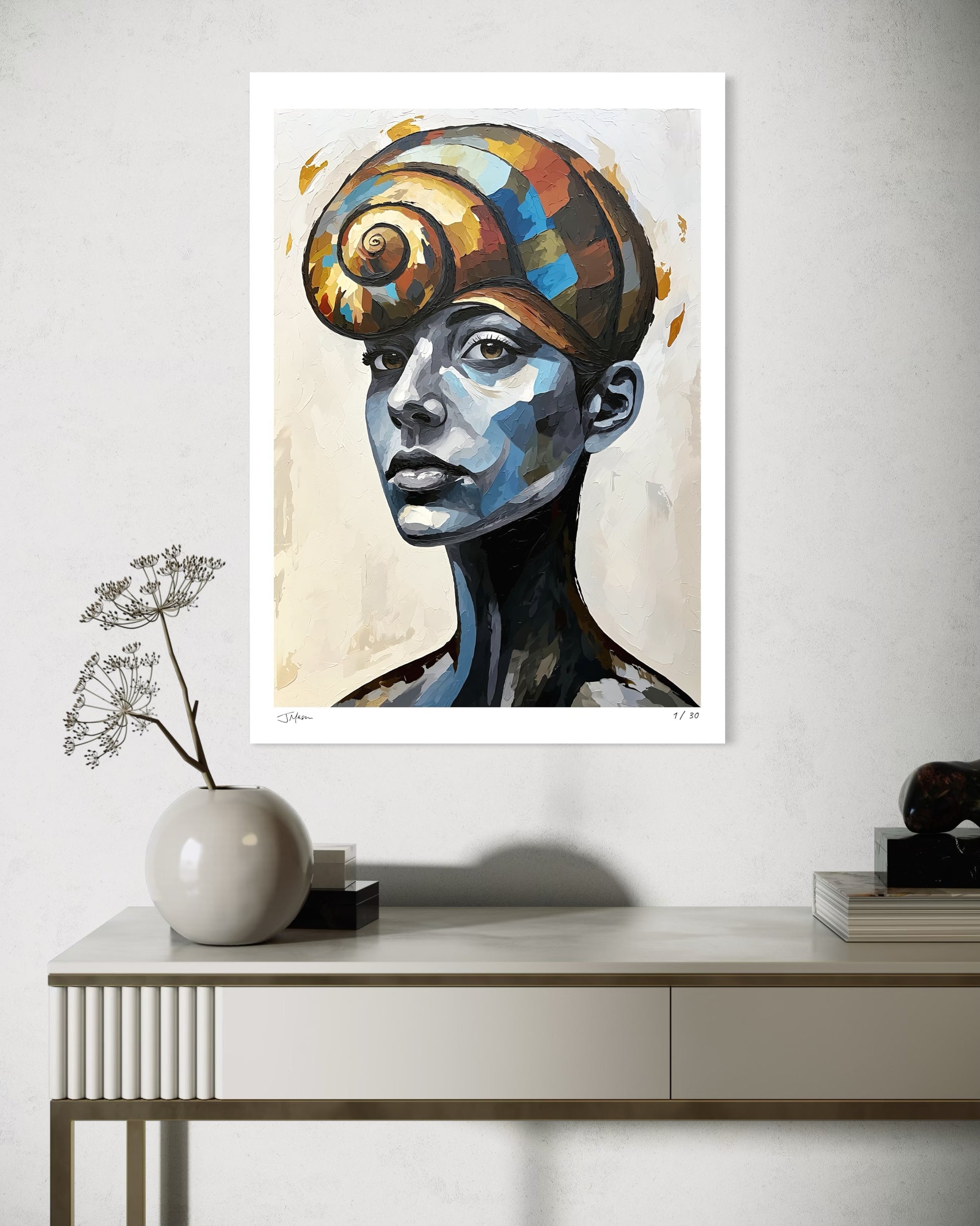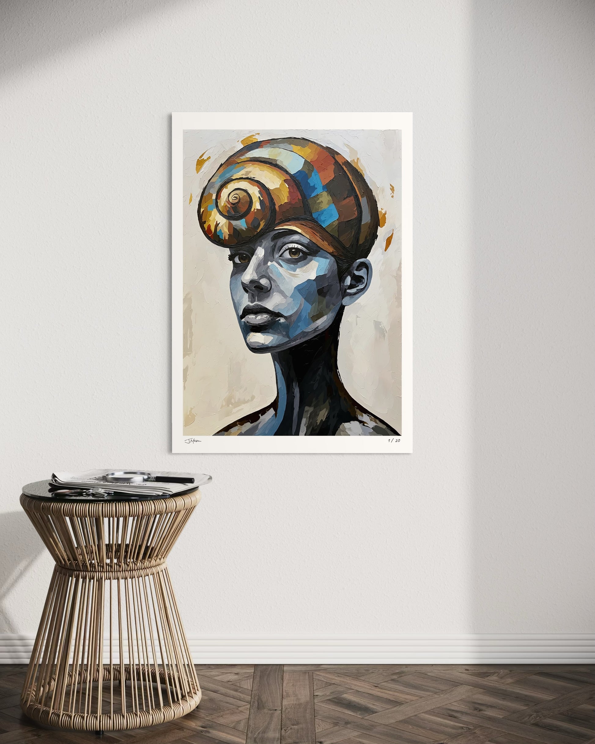 Shellbound No More captures a moment of emergence and self-realization. The girl is crowned with a spiral shell, embodying growth and transformation. Through its cool tones and warm, vibrant shell, the piece reflects the beauty of stepping into the light, carrying both history and hope.