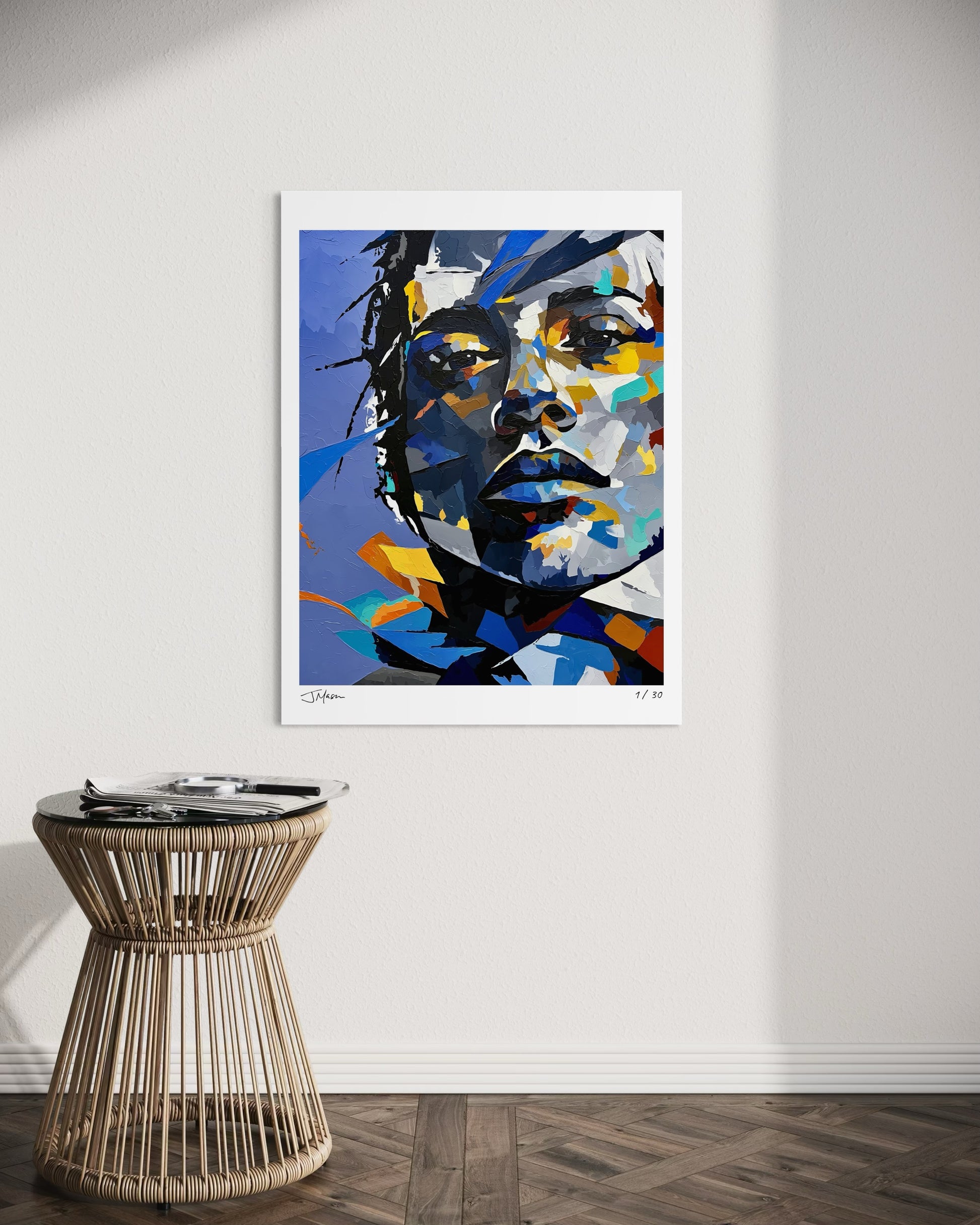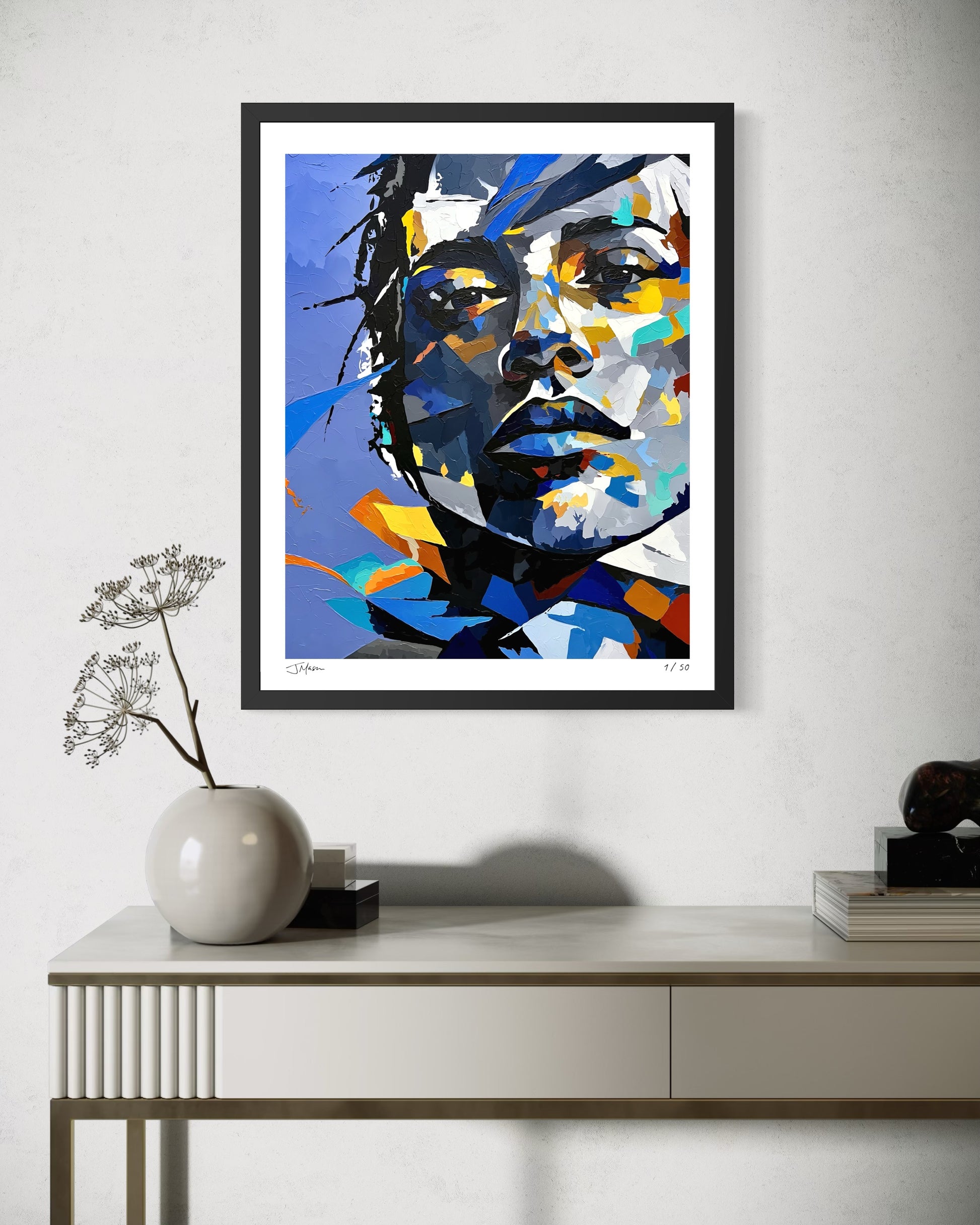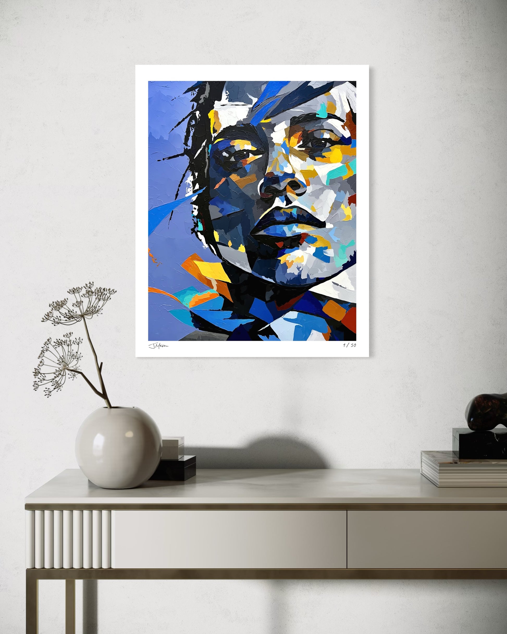 State of Mind is a bold portrait layered with deep blues, golds, and flashes of white and orange. The intense gaze pulls the viewer in, while fractured strokes suggest shifting thoughts and emotions. This print captures the complexity of inner landscapes and human perception.