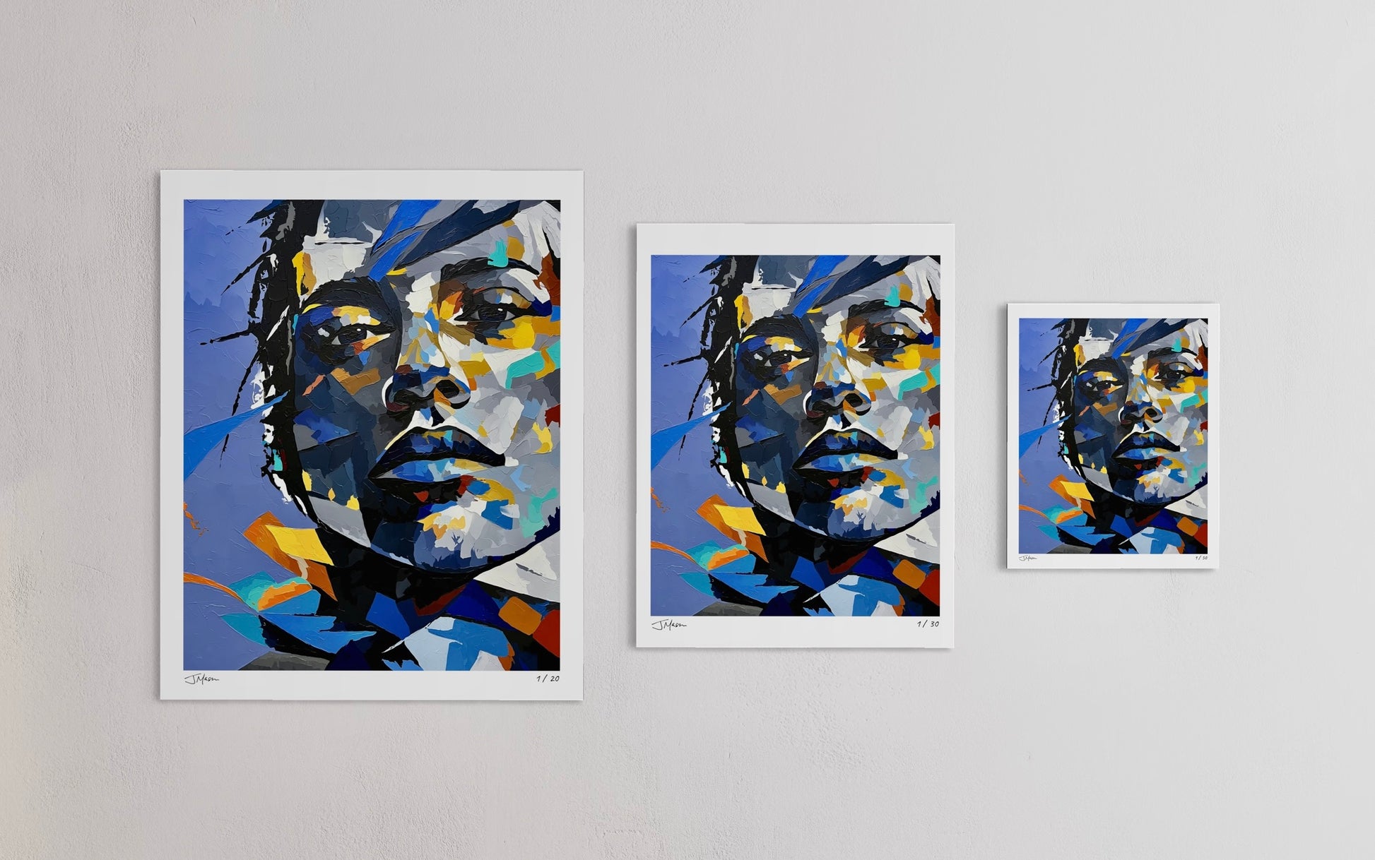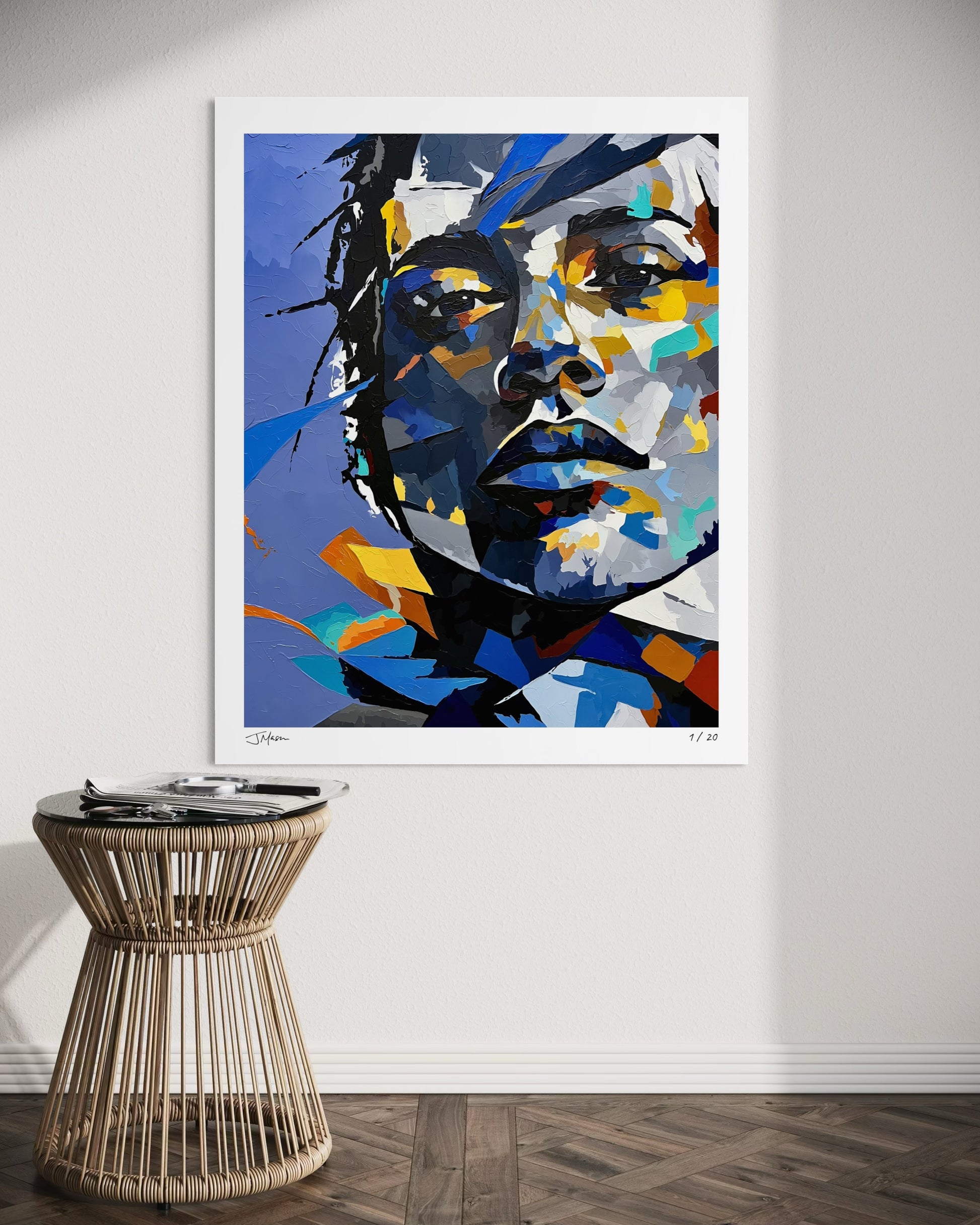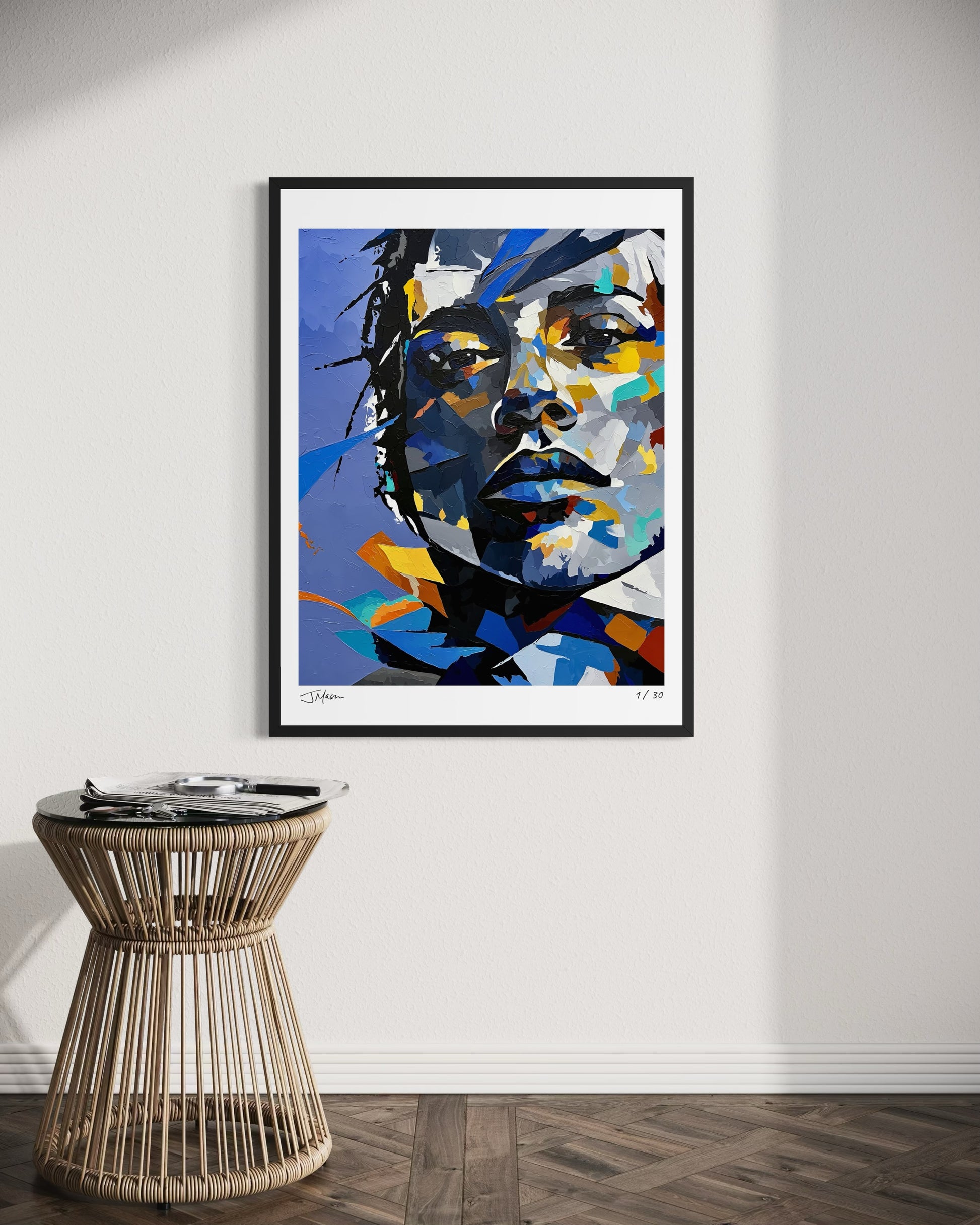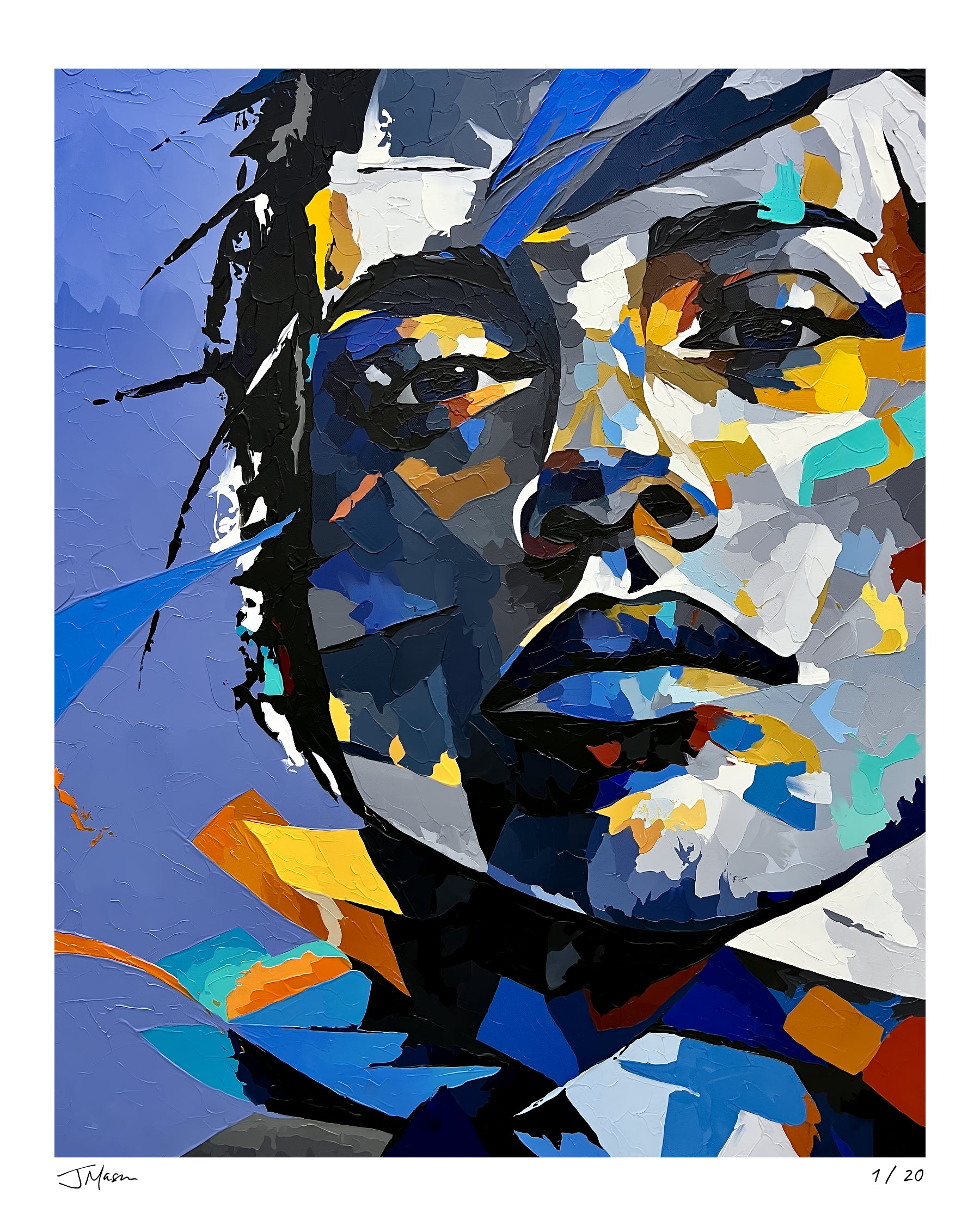 State of Mind is a bold portrait layered with deep blues, golds, and flashes of white and orange. The intense gaze pulls the viewer in, while fractured strokes suggest shifting thoughts and emotions. This print captures the complexity of inner landscapes and human perception.