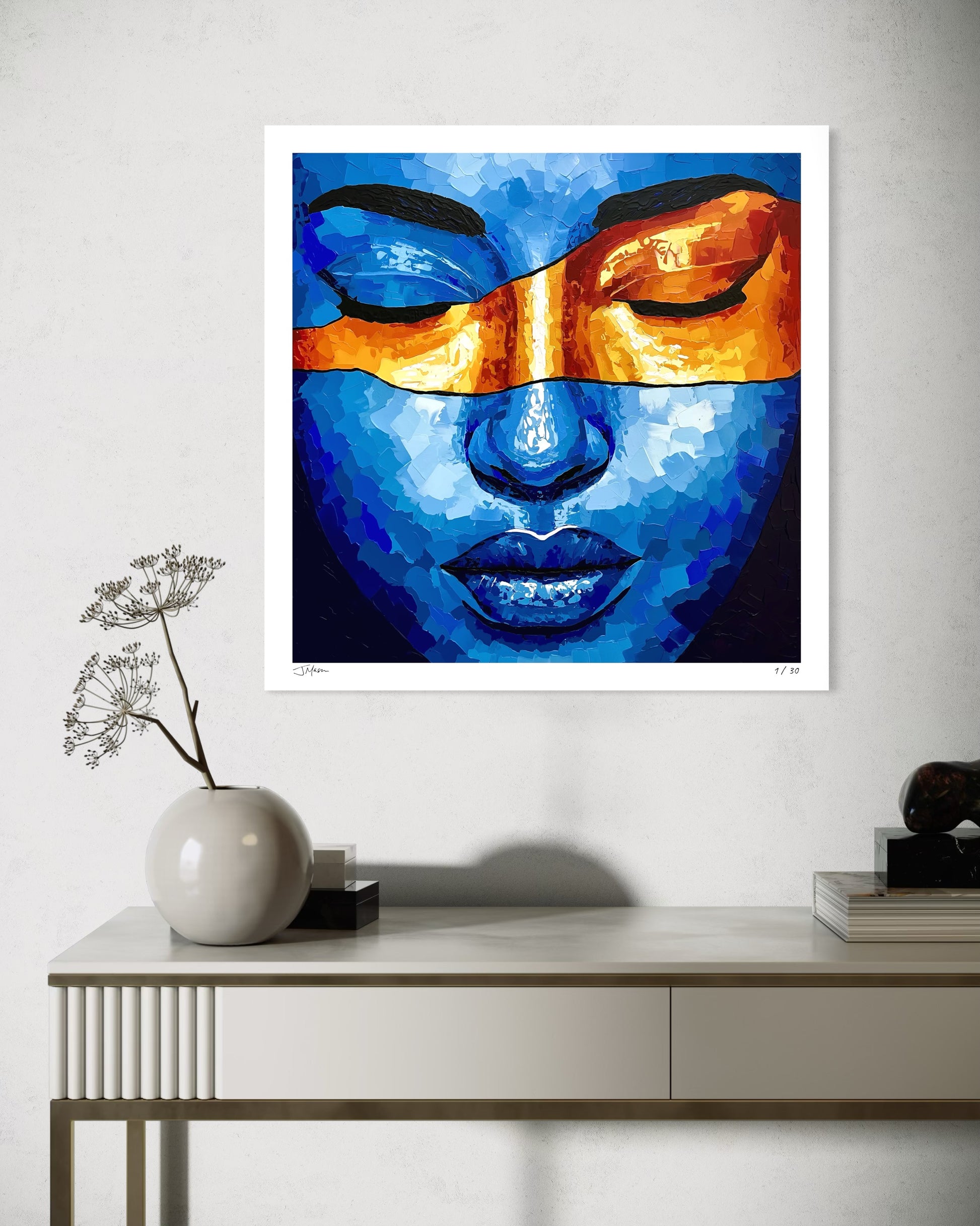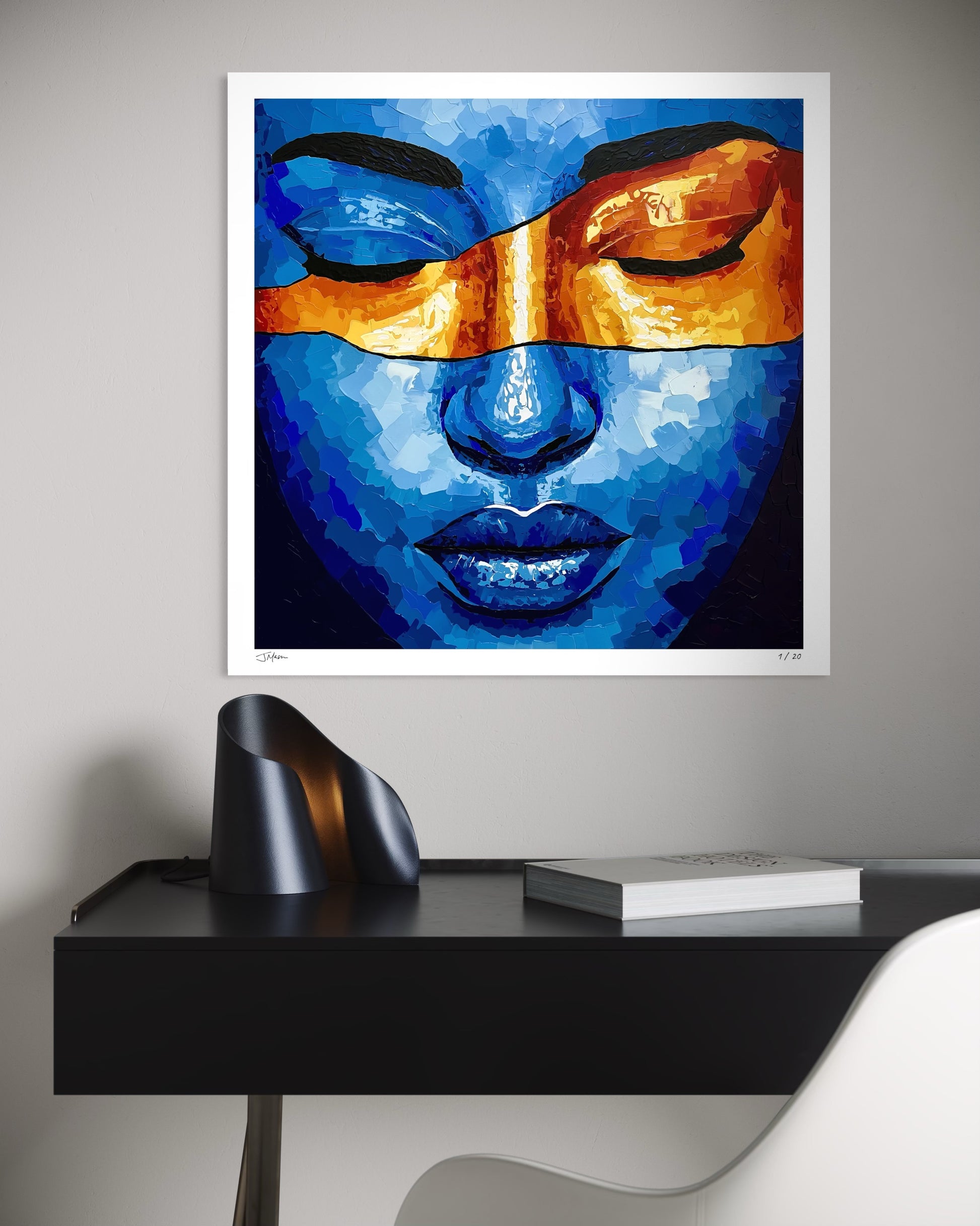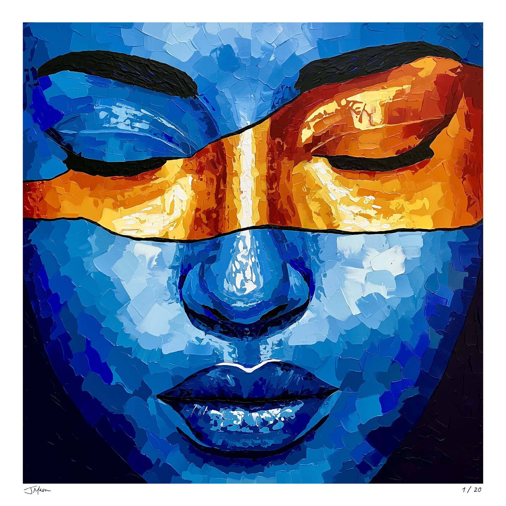 Temporary Bliss is an intimate portrait bathed in deep blues, with a radiant band of orange sweeping across closed eyes. The bold contrast of color and texture evokes a fleeting moment of peace, where stillness and intensity coexist in perfect balance.