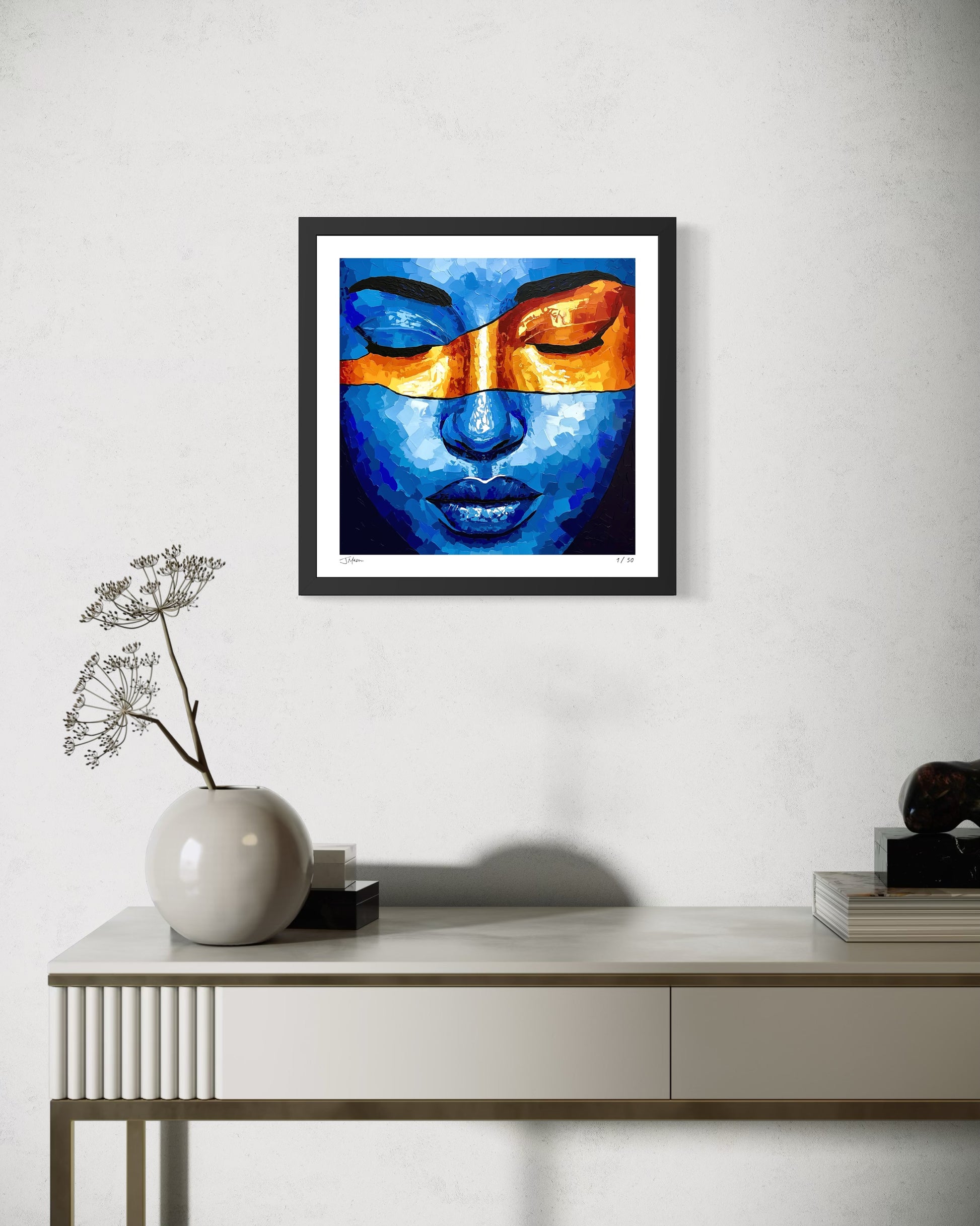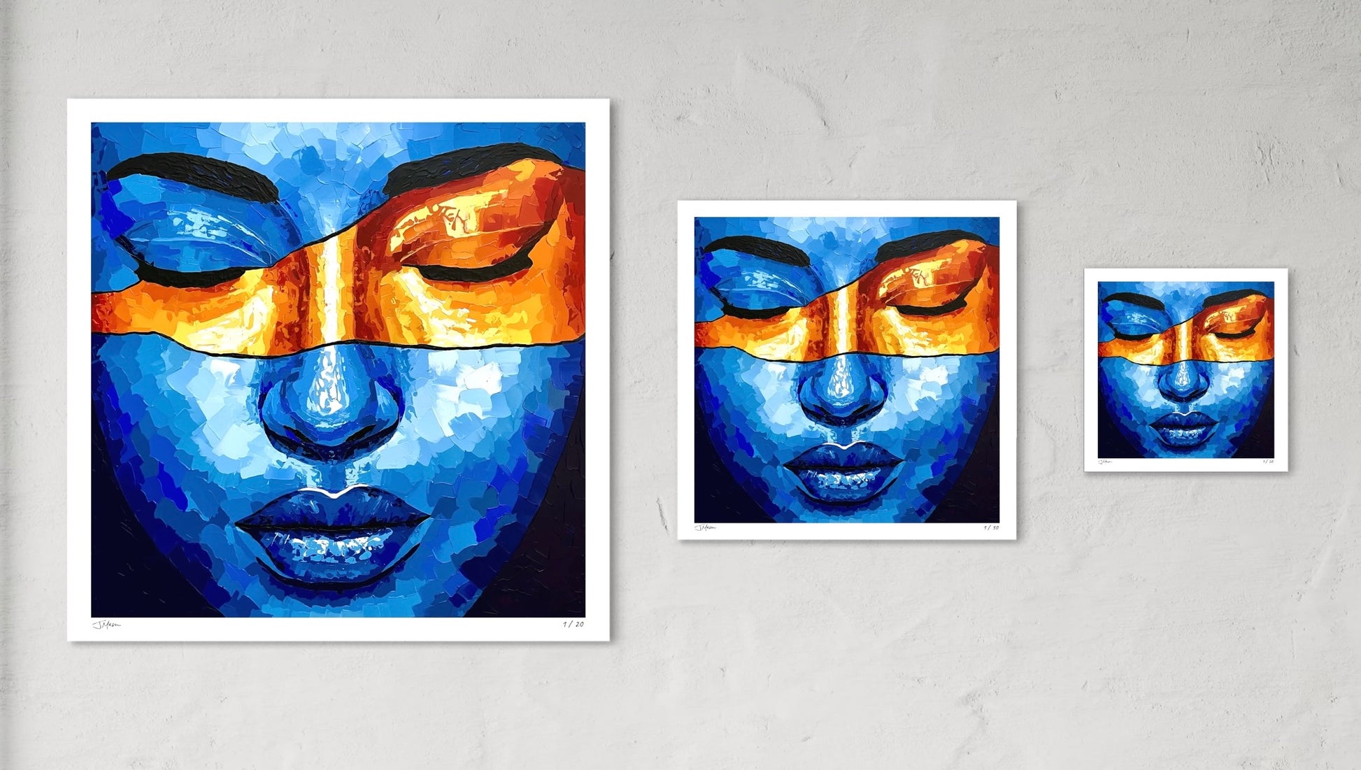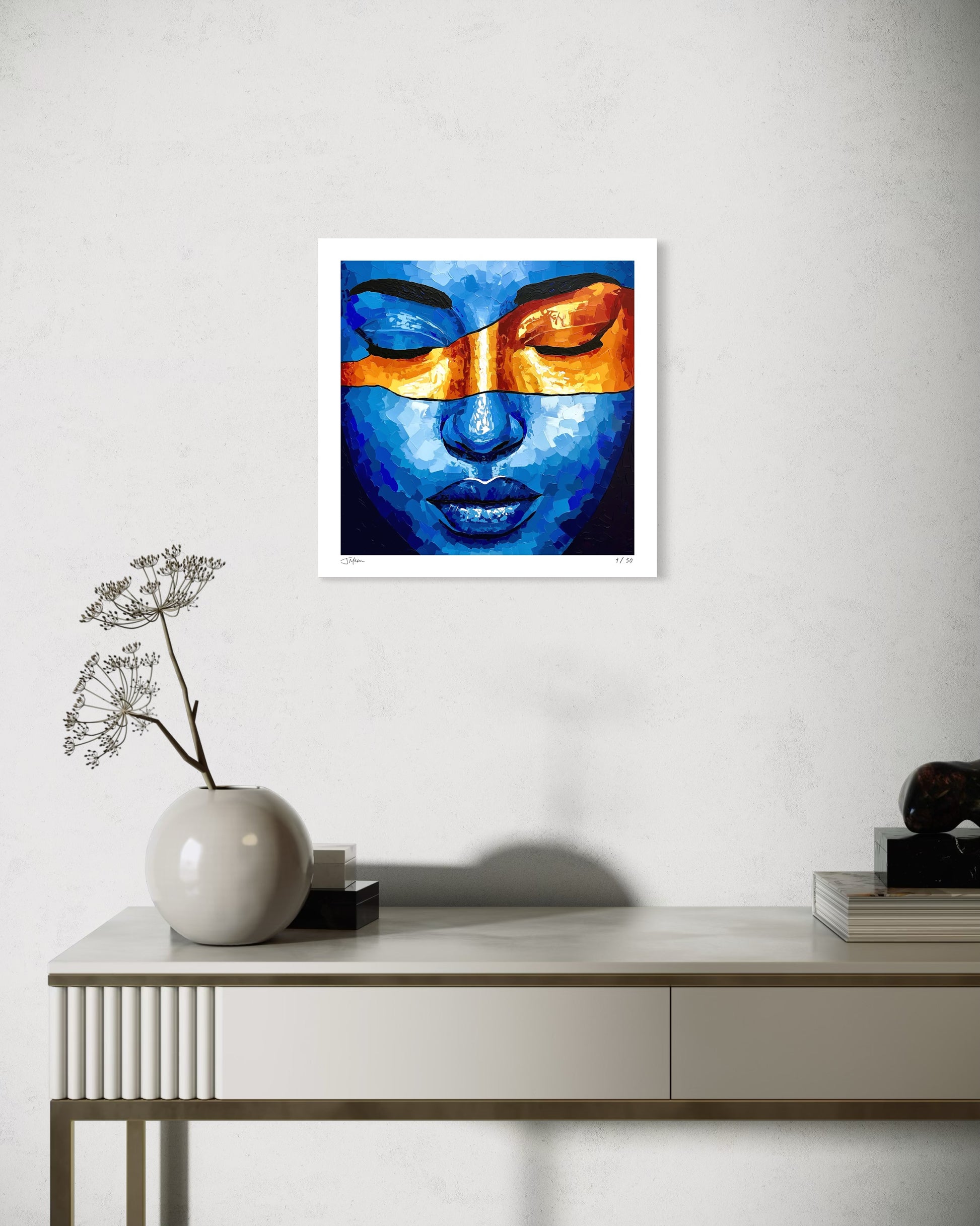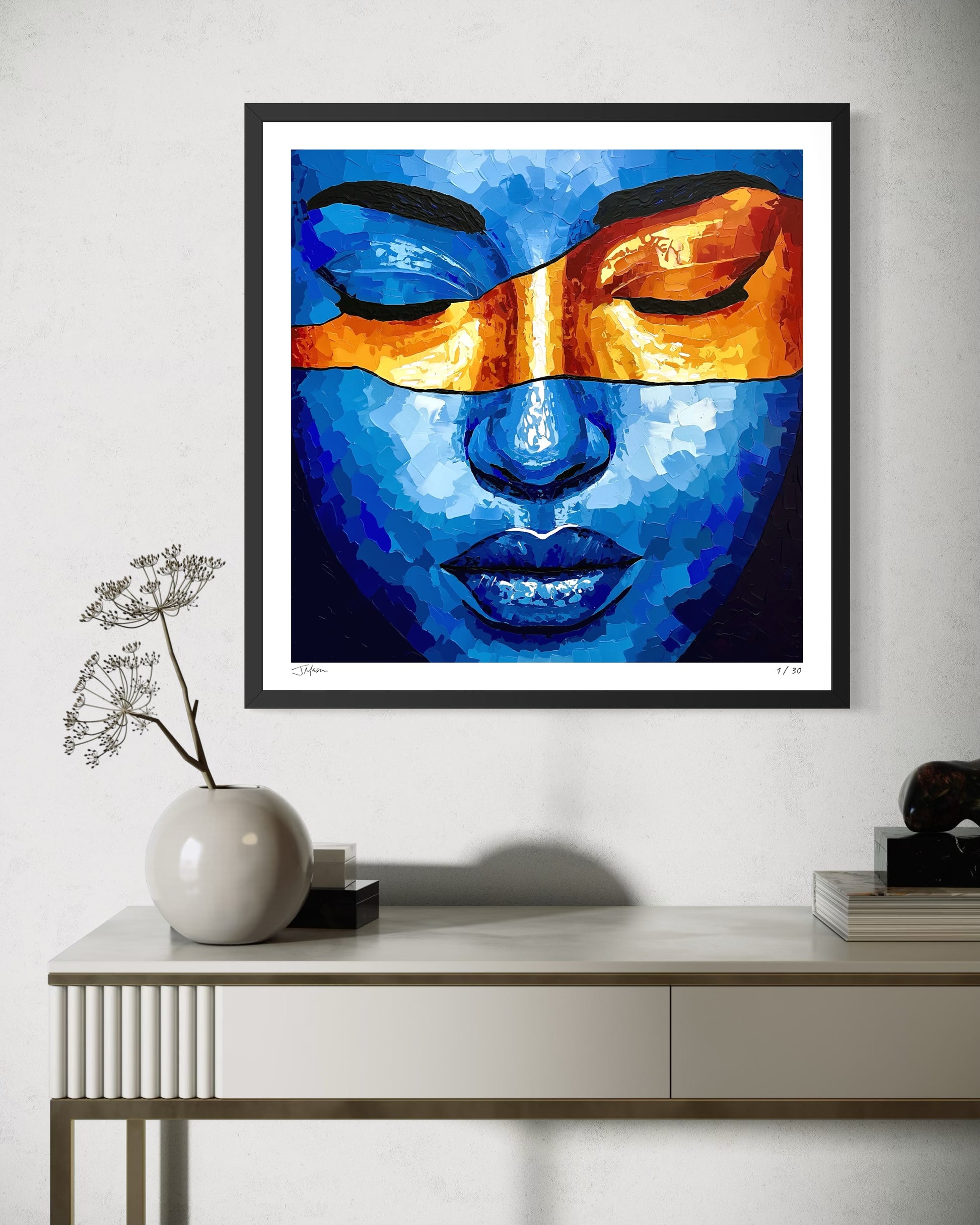 Temporary Bliss is an intimate portrait bathed in deep blues, with a radiant band of orange sweeping across closed eyes. The bold contrast of color and texture evokes a fleeting moment of peace, where stillness and intensity coexist in perfect balance.