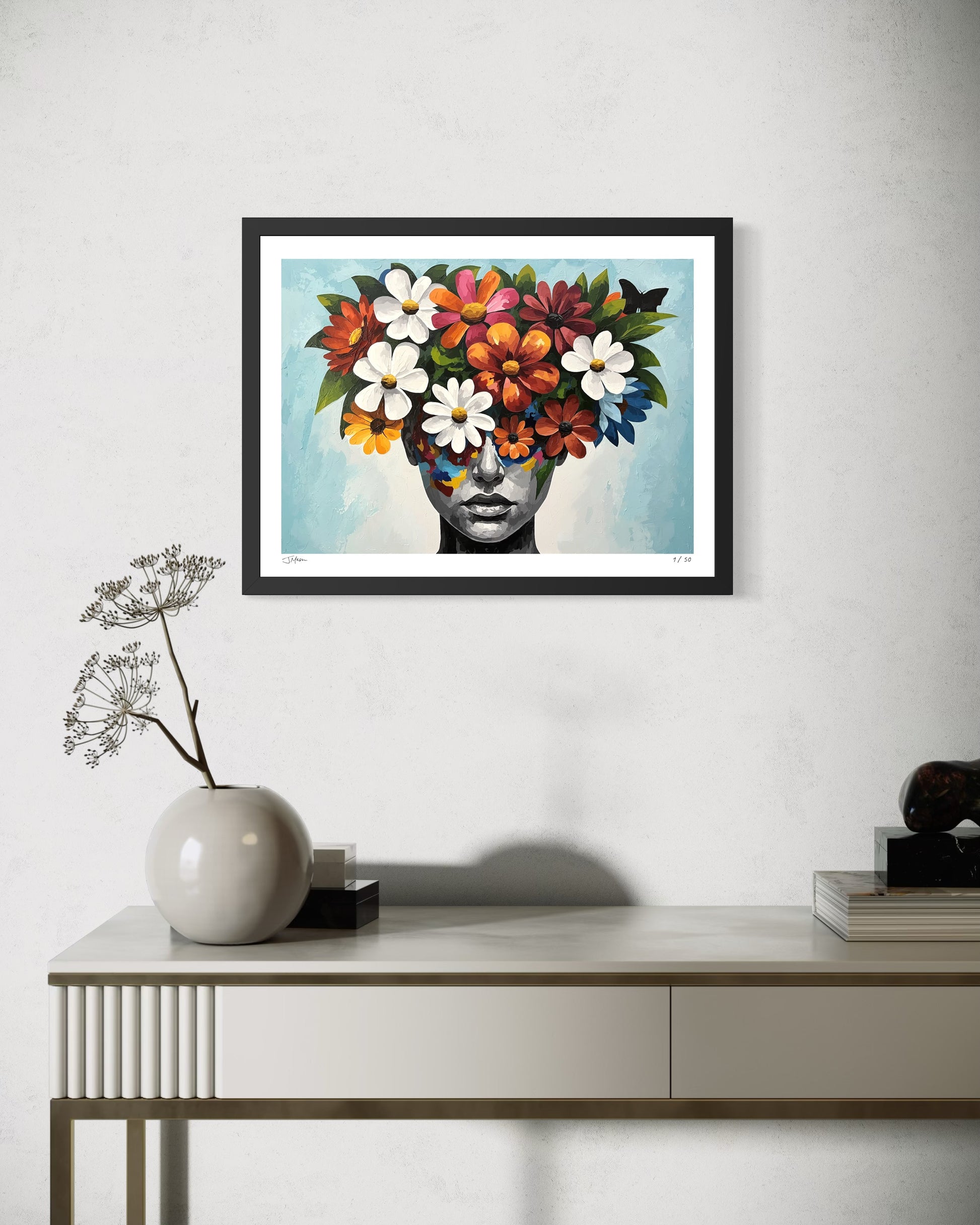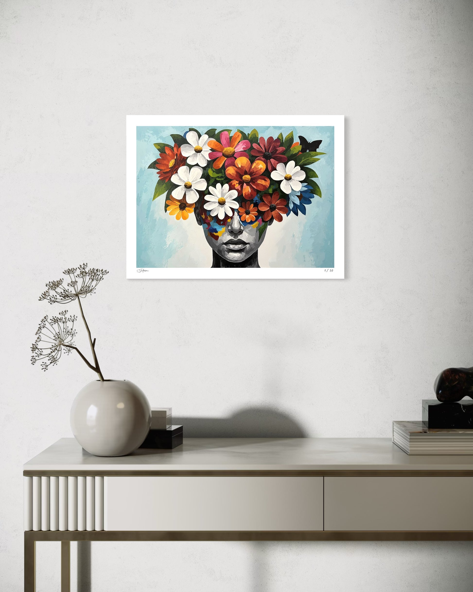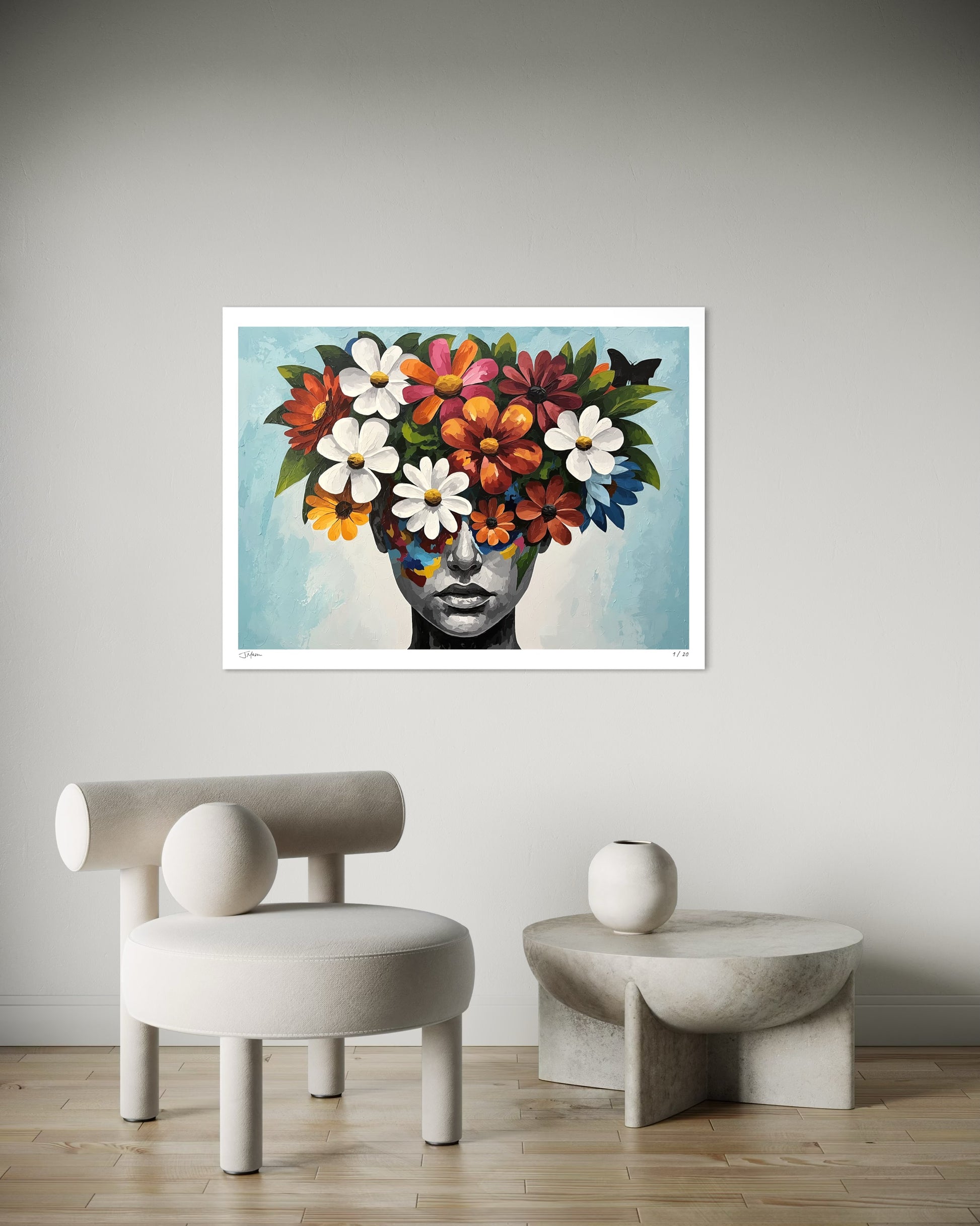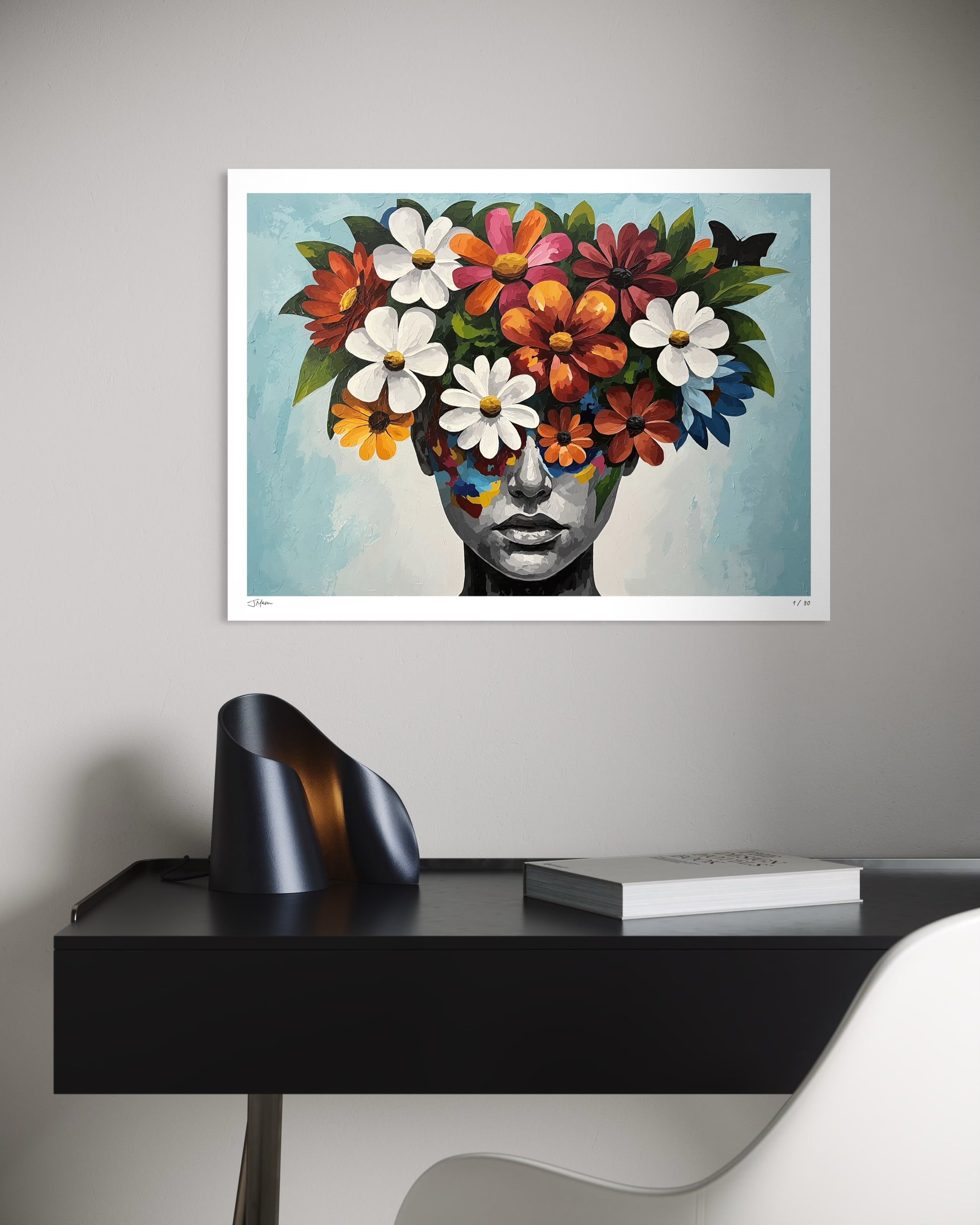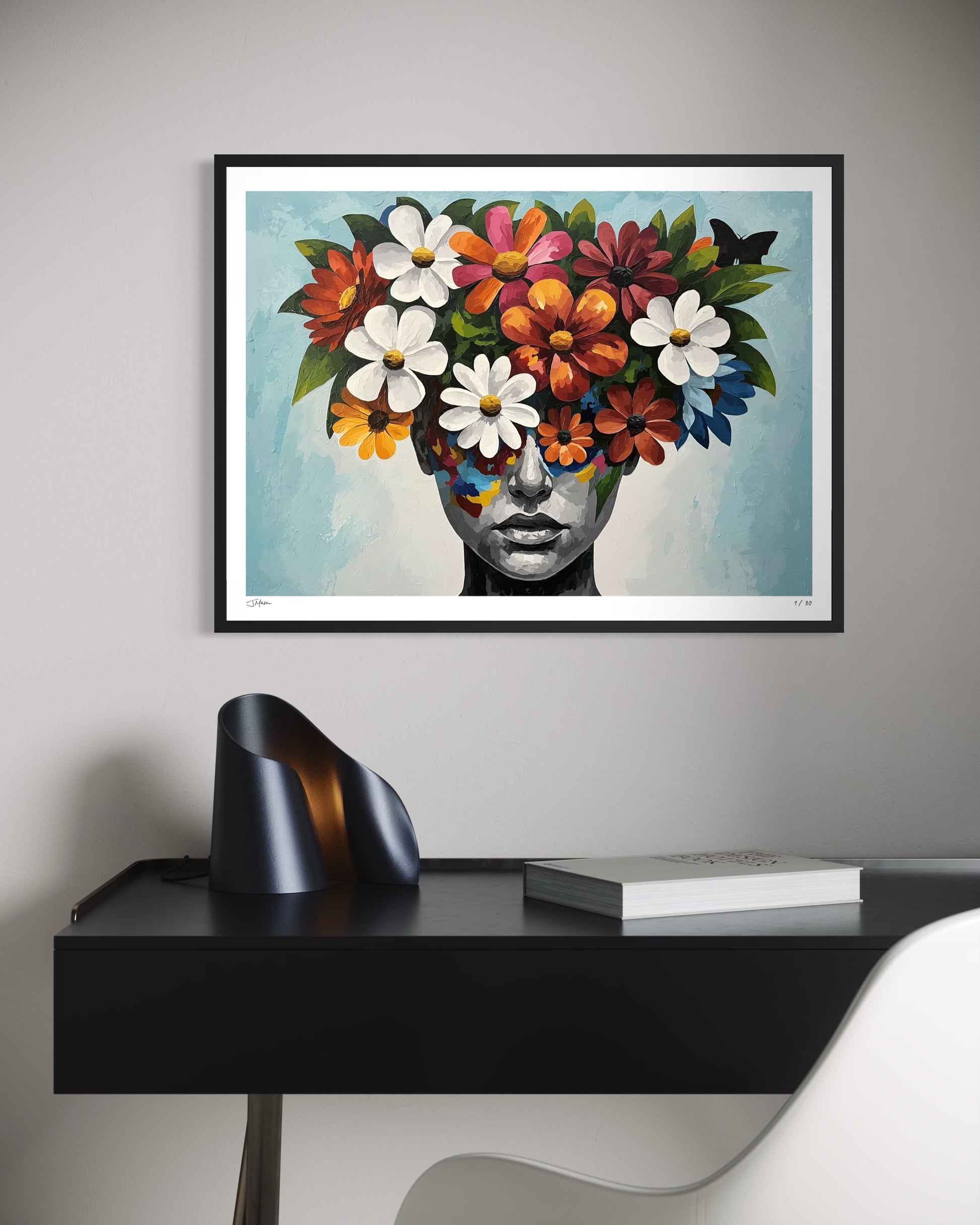 Wildflower is a vibrant, semi-abstract portrait where blossoms bloom from the figure’s head, symbolizing growth, freedom, and untamed beauty. The grayscale face contrasts with the vivid palette of flowers, celebrating the harmony between human identity and nature’s wild spirit.