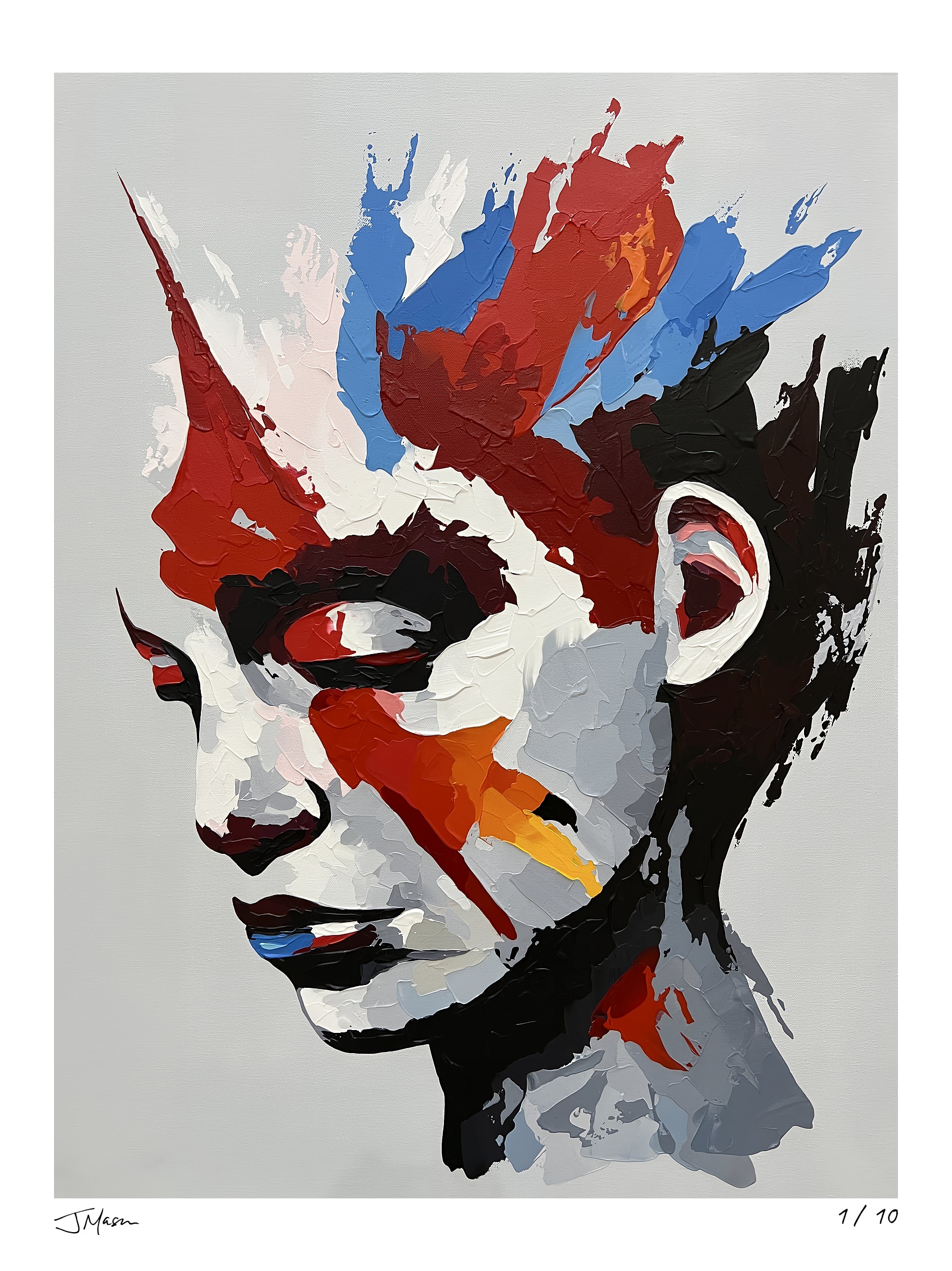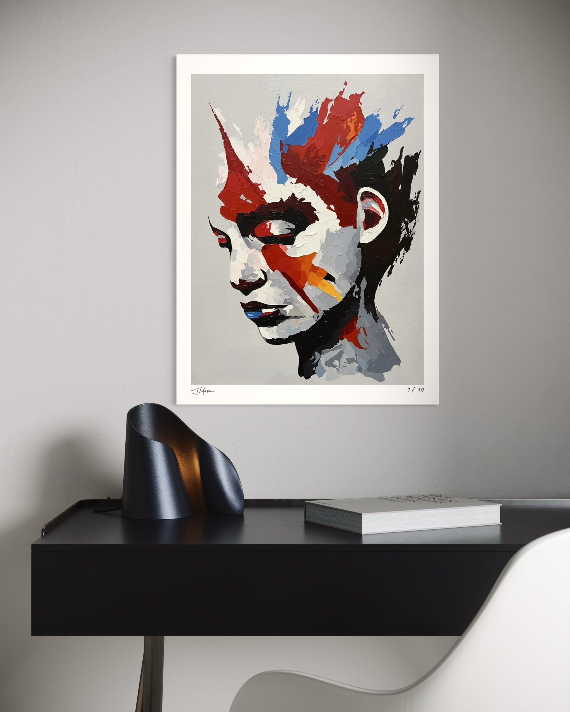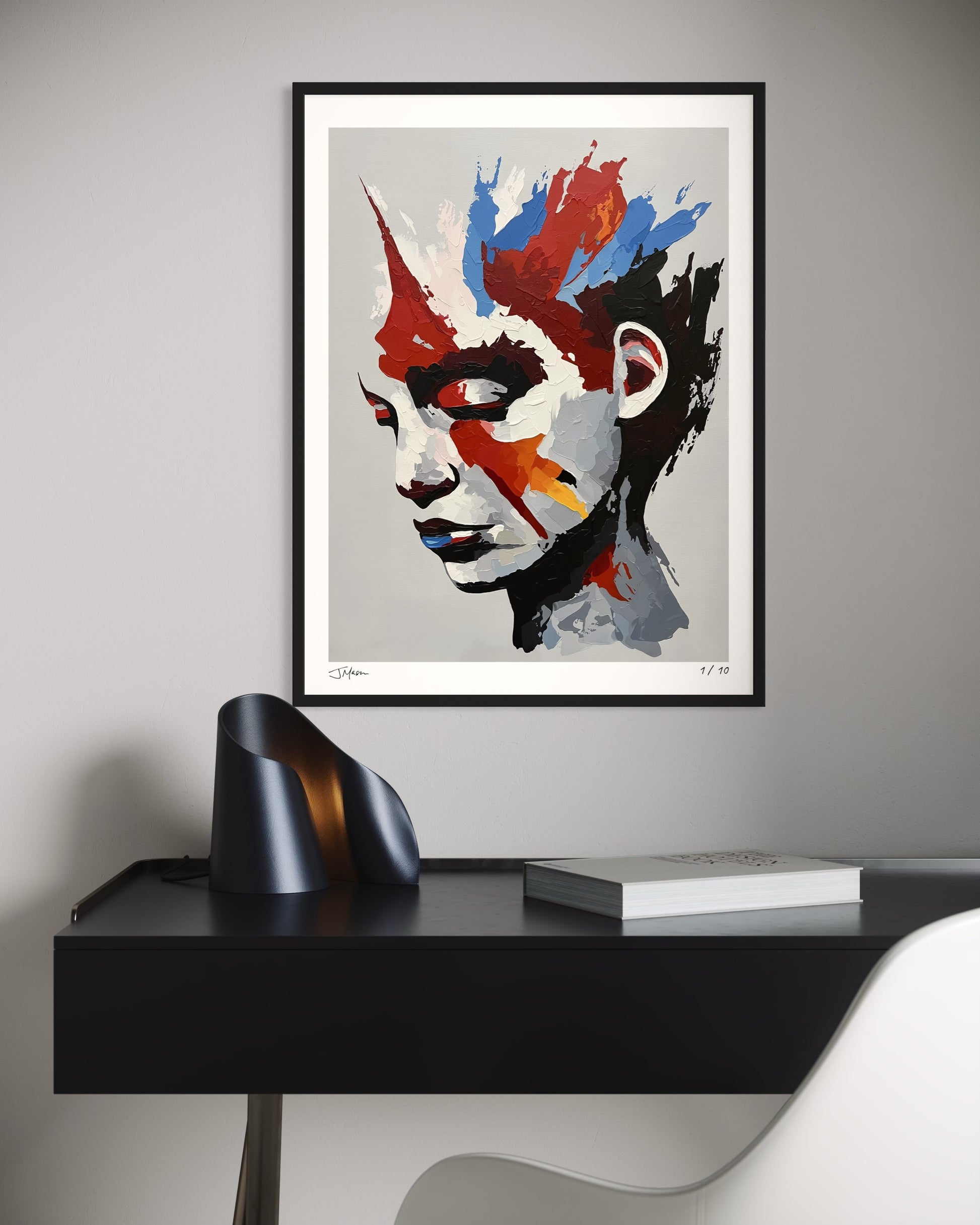 Within My Mind is a contemplative portrait where bold, abstract strokes erupt from the figure’s head, symbolizing thought, memory, and inner energy. The grayscale face, painted with quiet intensity, contrasts against the explosive colors, capturing the complexity of the human psyche.