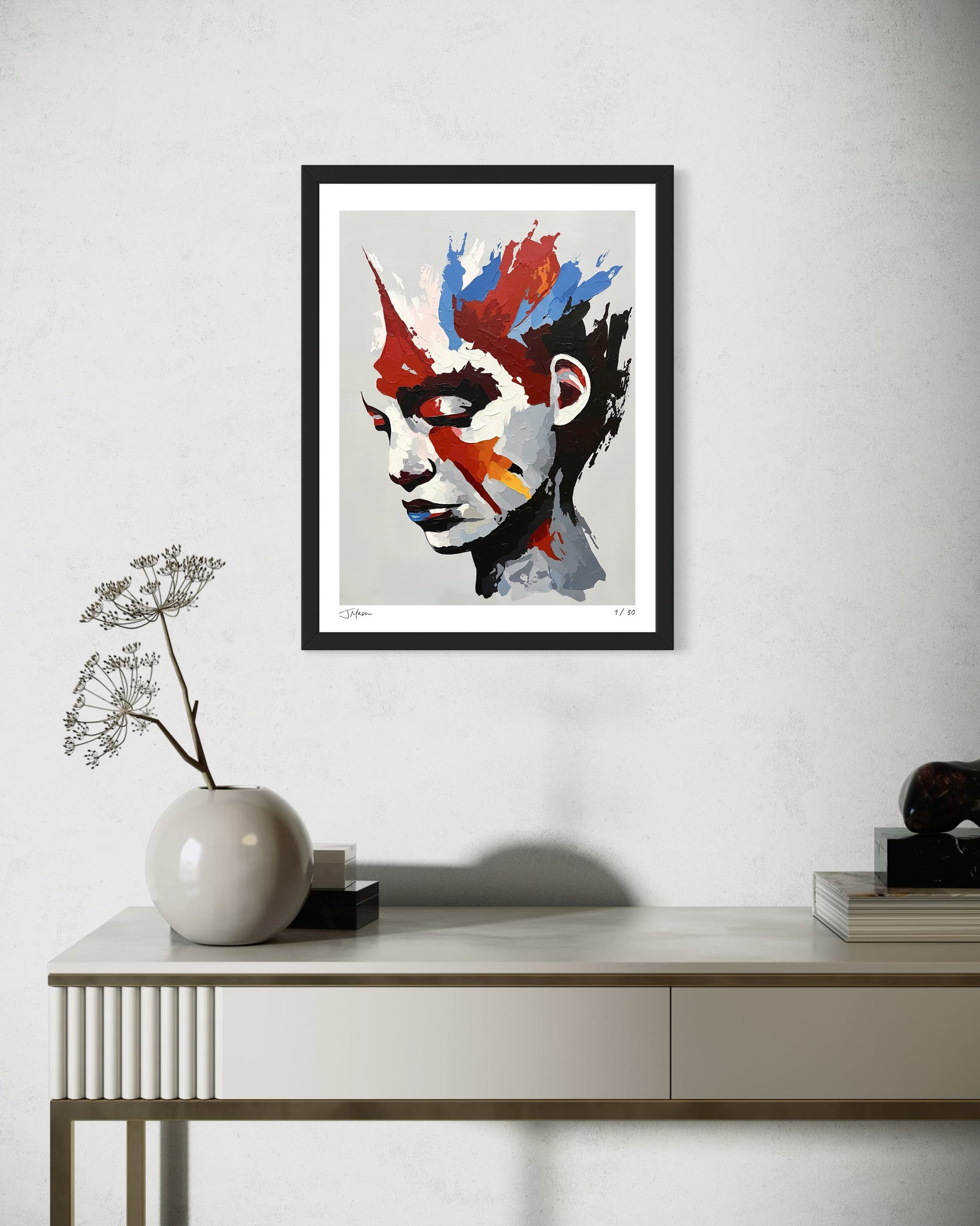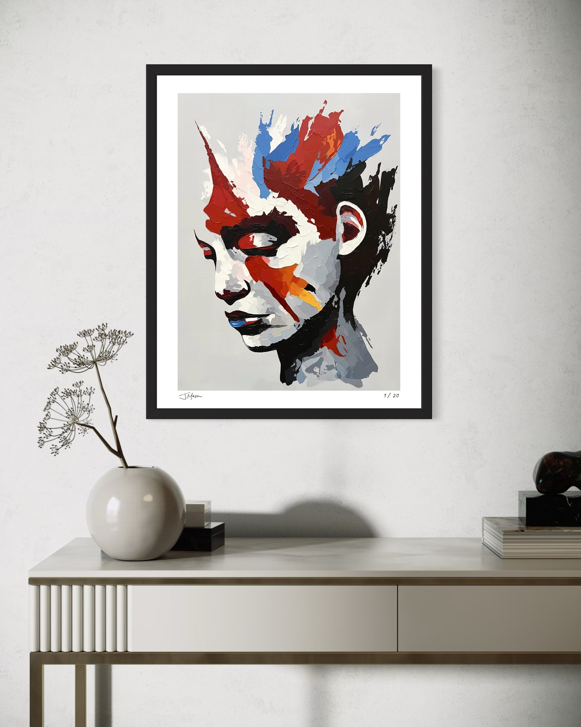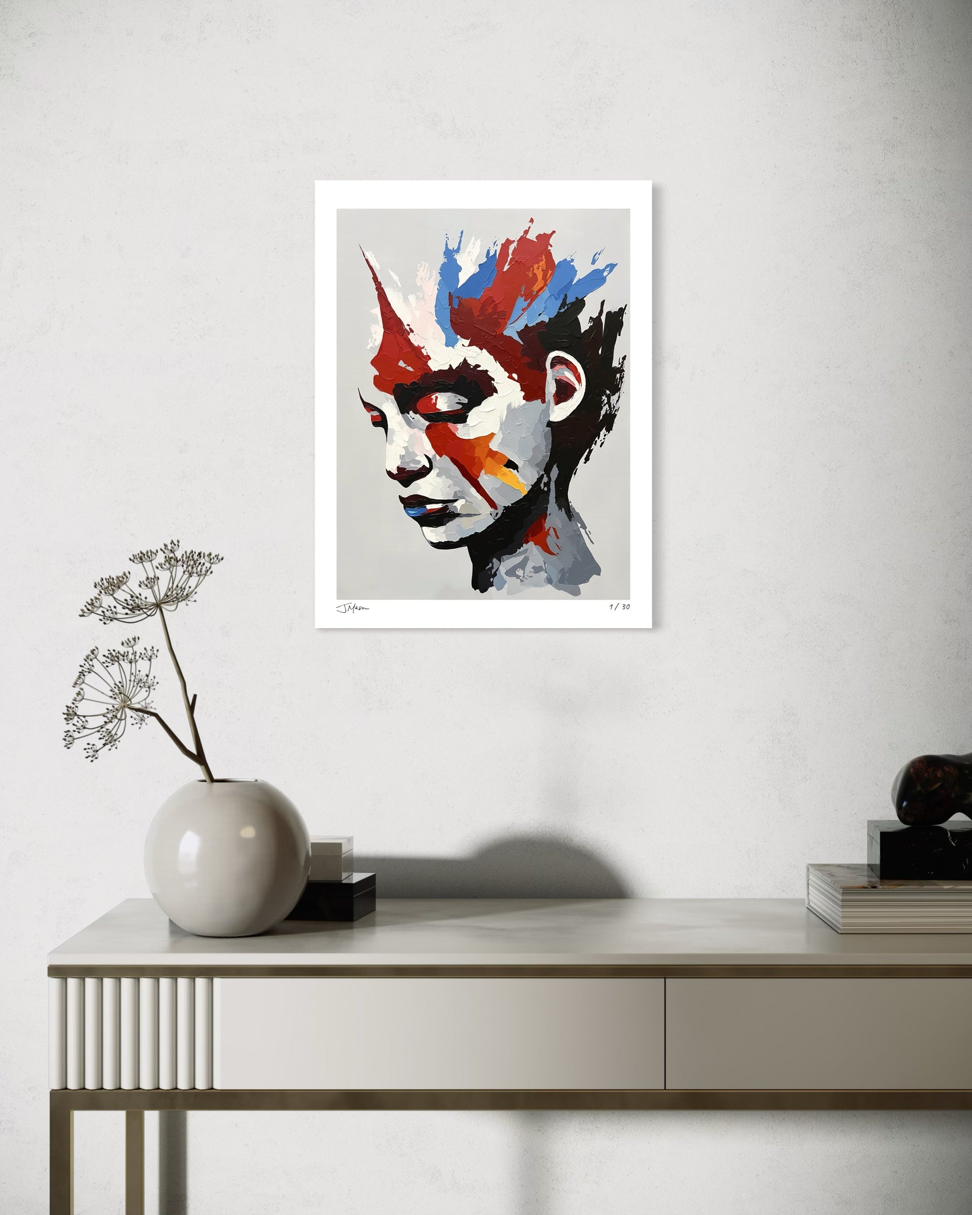 Within My Mind is a contemplative portrait where bold, abstract strokes erupt from the figure’s head, symbolizing thought, memory, and inner energy. The grayscale face, painted with quiet intensity, contrasts against the explosive colors, capturing the complexity of the human psyche.
